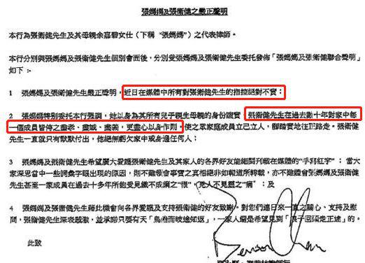 控诉张卫健拖欠我方两千万元的薪酬,并拦阻他和母亲碰面。