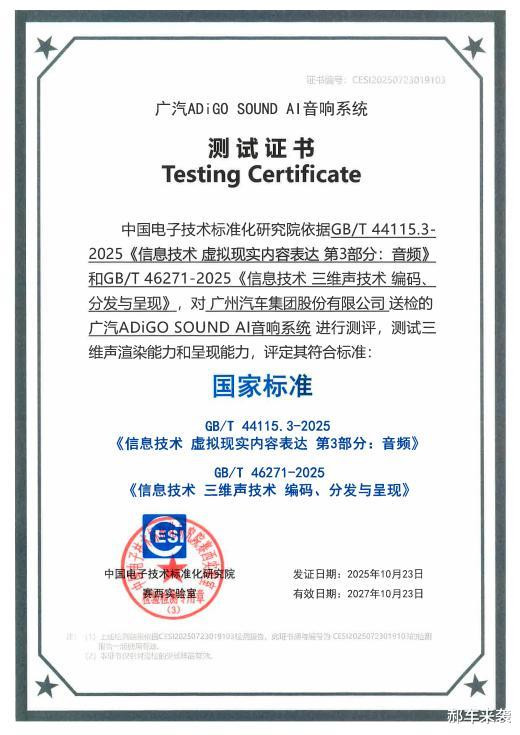 近日,广汽ADiGO SOUND 2.0 AI音响系统通过工业和信息化部中国电子时候行为化参议院巨擘检测,获颁宇宙首个双国标菁彩声息响系统测评文凭,成为行业首款三维声渲染材干和呈现材干同期得志GB/T 44115.3-2025《信息时候 编造本质骨子抒发 第3部分:音频》与GB/T 46271-2025《信息时候 三维声时候 编码、分发与呈现》两项国标的车载音响系统。