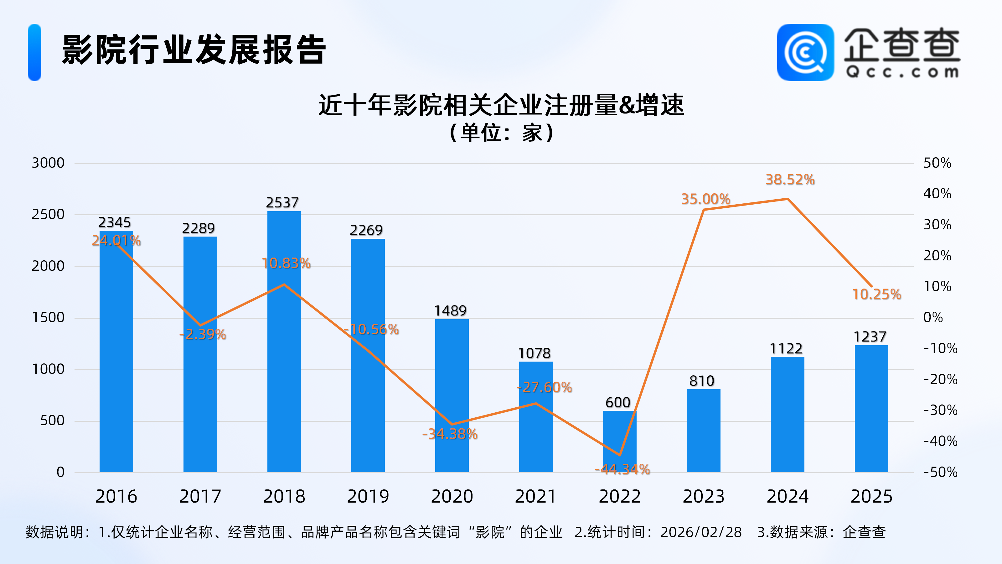 企查查数据露馅,截止2月底,国内现有影院经营企业1.52万家。近十年经营企业注册量呈先减后增态势,2023年影院经营企业注册量触底反弹,同比增长35.00%至810家。此后2024年、2025年继续增势,折柳同比增长38.52%、10.25%至1122家、1237家。截止当今,本年已注册106家。