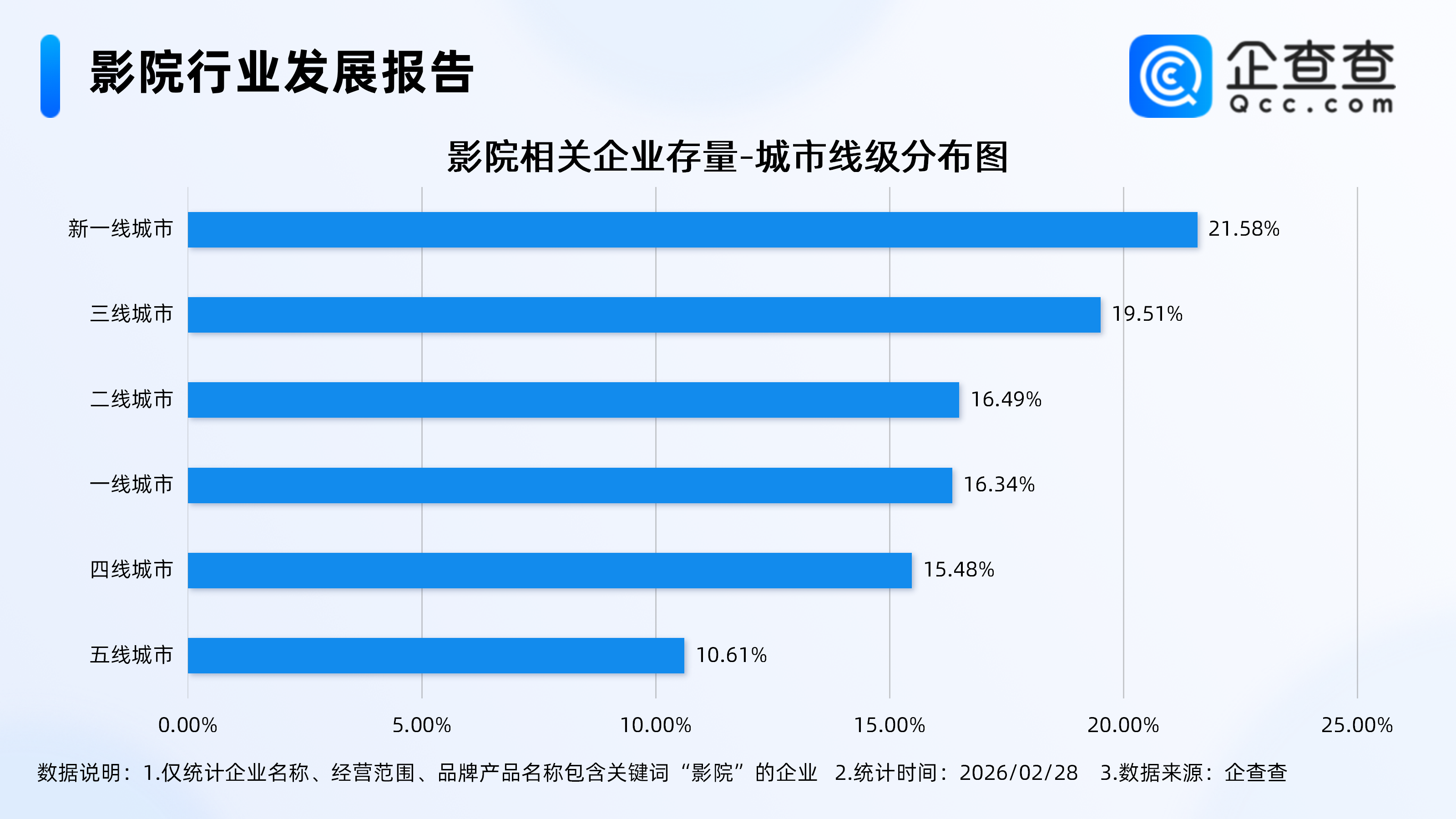 企查查数据露馅,从城市线级漫步来看,漫步在新一线城市的影院经营企业最多,占比21.58%。其次,漫步在三线城市、二线城市的影院经营企业折柳占比19.51%、16.49%。