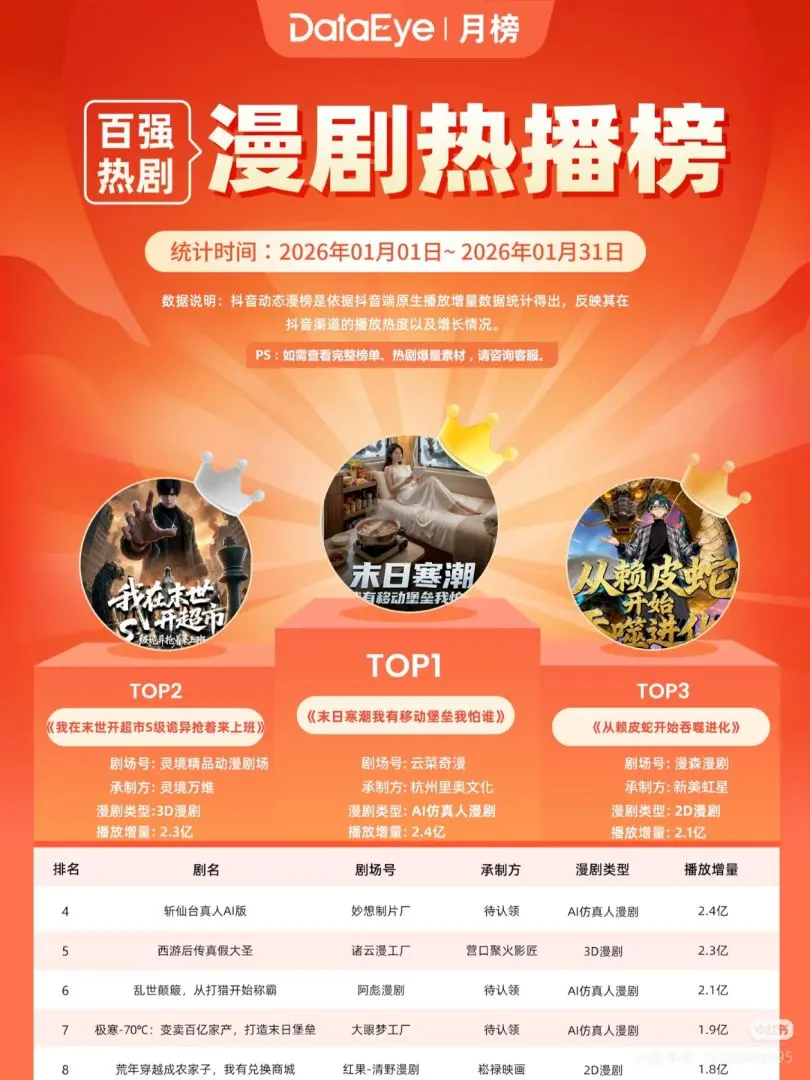 字据DateEye数据统计,2026年1月漫剧百强榜中,飙升最快的来自于AI仿真东谈主剧,百强率从客岁7%普及至38%,共计播放量达25.48亿。其中,《末日寒潮我有挪动堡垒我怕谁》凭借2.3亿播放增量问鼎1月漫剧TOP1,在题材、类型上齐全了漫剧市集的新冲突;同期,冲突10亿播放的AI 2D漫剧《斩仙台下,我恐慌了诸神》的AI仿真东谈主版《斩仙台真东谈主AI版》上架不到一周,也达成播放量冲突1亿。