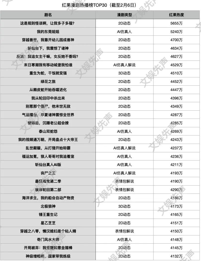 升天2月6日,红果漫剧热播榜炫耀,TOP30中共有8部为AI仿真东谈主剧,TOP100中共计仅有25部为AI仿真东谈主剧。包括《我的东莞姐姐》《末日寒潮我有挪动堡垒我怕谁》等。从上榜作品类型上来看,“AI+仿真东谈主”类漫剧基本上以AI仿真东谈主演绎、AI旁白阐述为主。其中,AI仿真东谈主演绎漫剧题材相对泛化,而AI旁白阐述仿真东谈主漫剧类型中,末日、宅斗、逆袭题材则相对吃香。