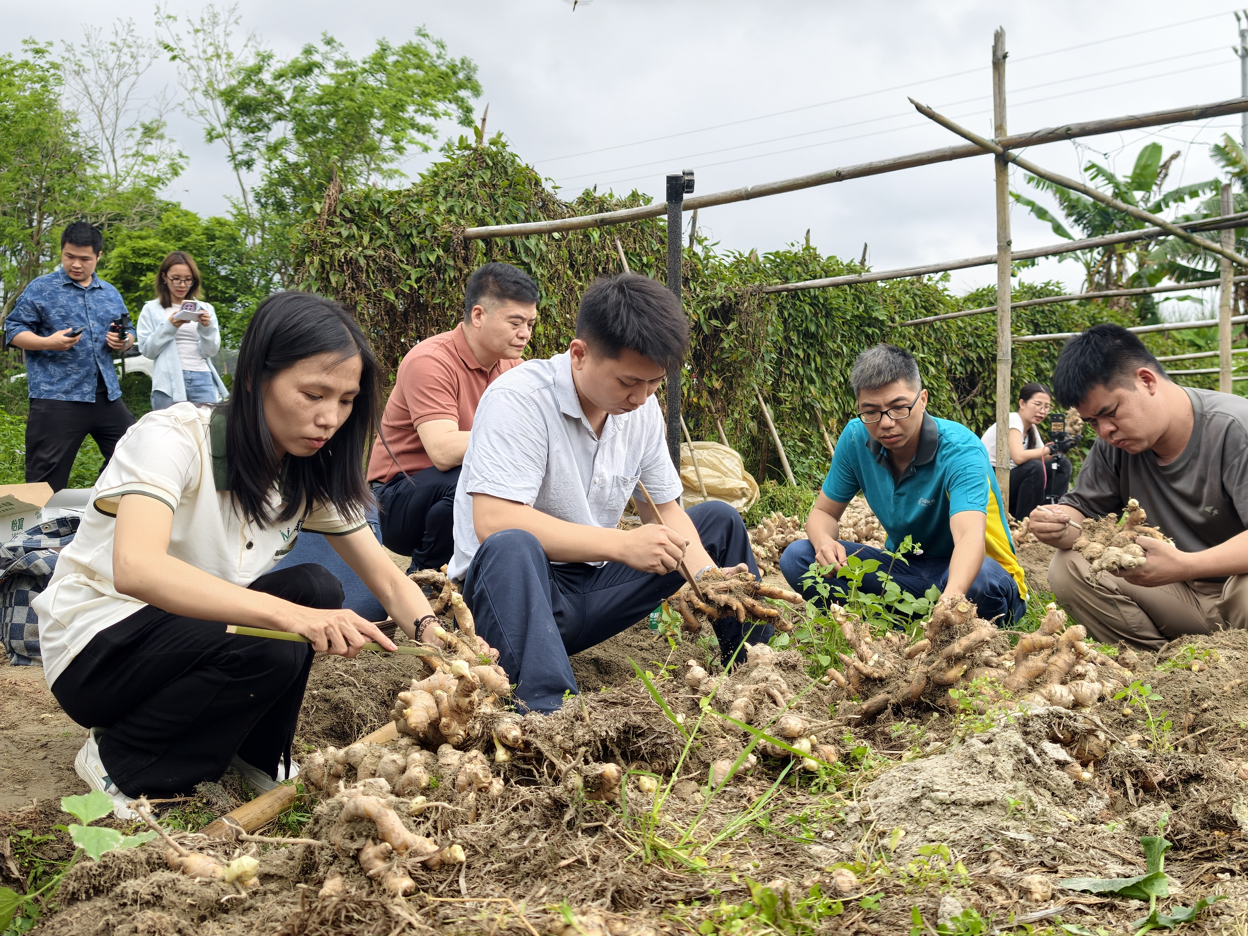 4月8日清早,文静区更合镇香山圩的姜田上,一顶顶帐篷整都搭建,直播中控台有序摆放,一场吵杂的“爱心助农合水生姜专场直播”负责启幕。8个直播间同步开播,粤语、同样话轮替切换,视频号、抖音双平台联动,文静、禅城、三水等地的一众汇聚达东谈主都聚田头,用镜头为合水生姜“代言”,用行径破解姜农滞销贫窭,这场爱心直播线上线下预备售配置姜四万斤。