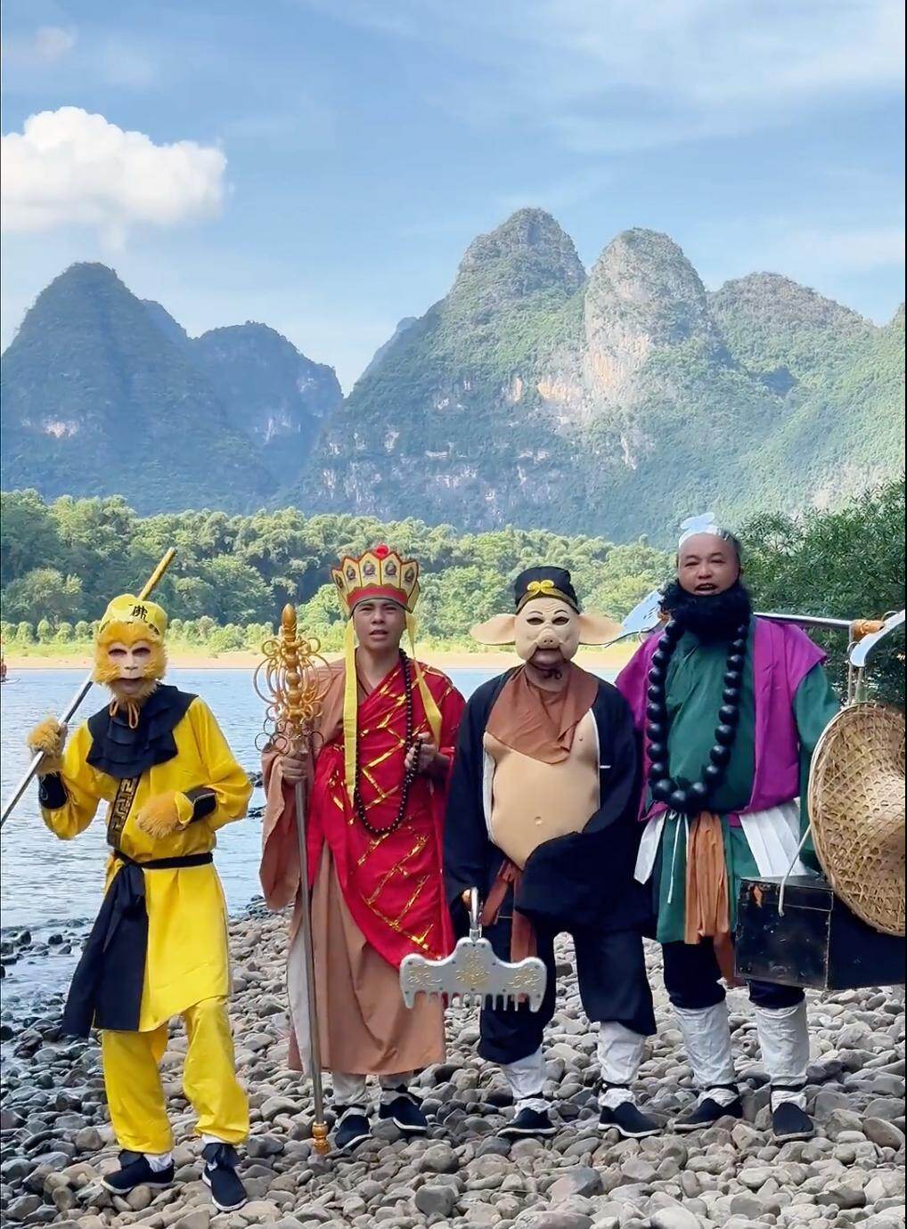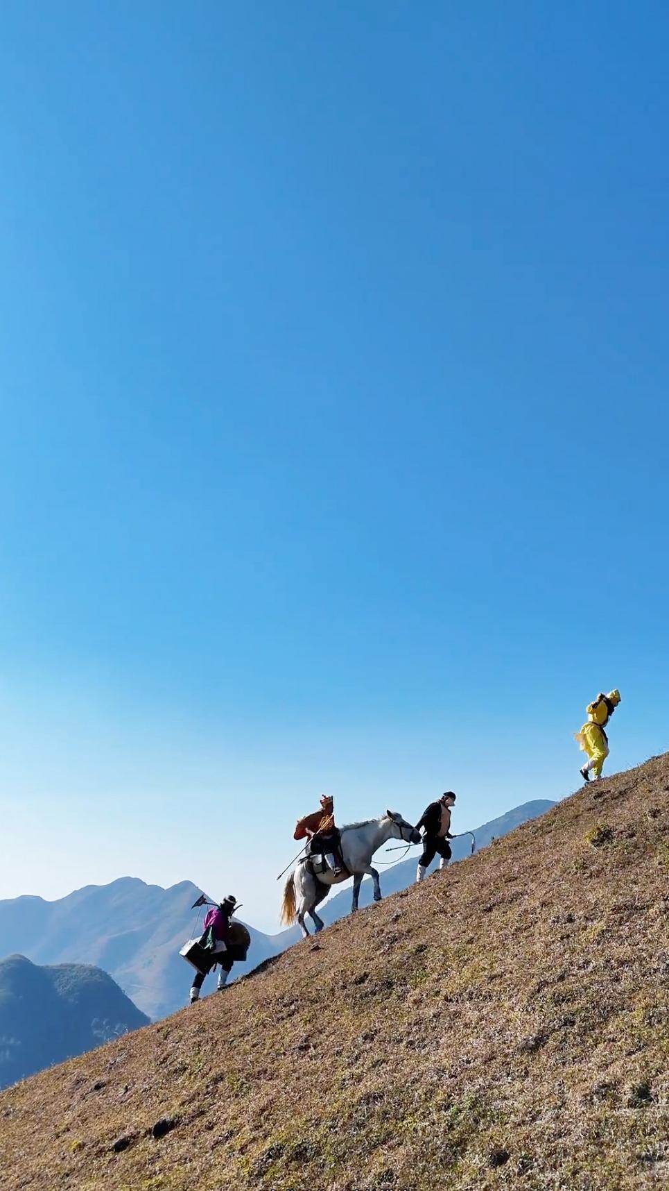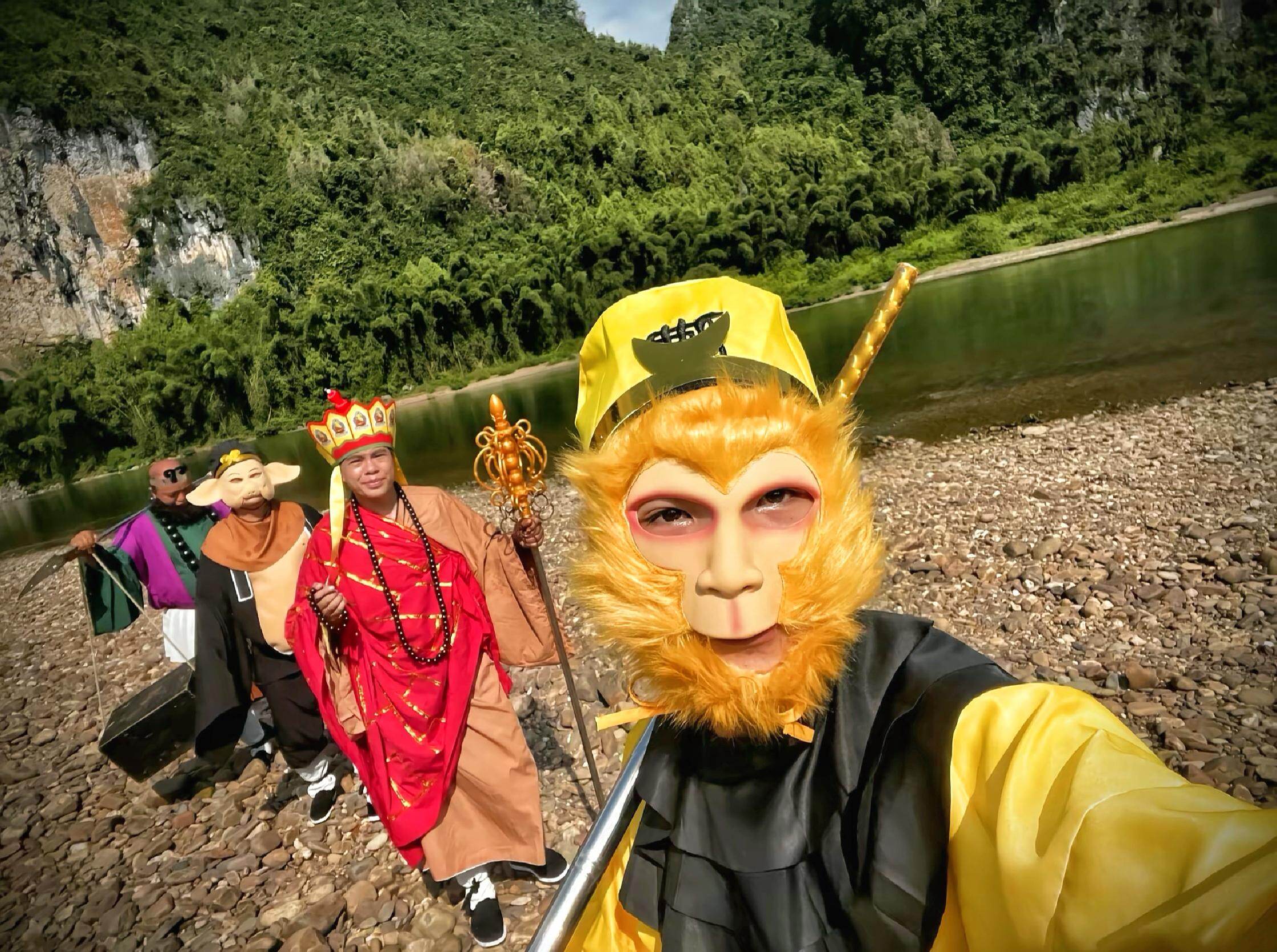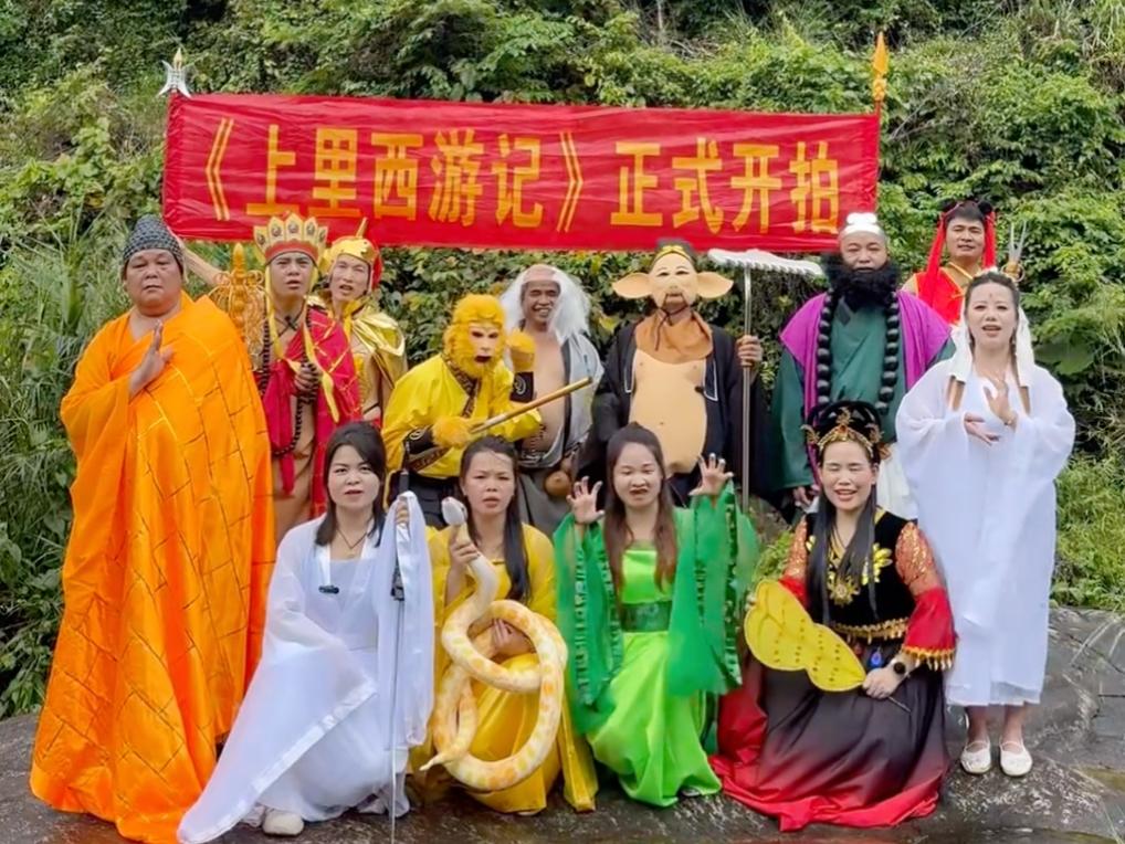 广西玉林北流平政镇,一条小路沿着丘陵往前蔓延,两旁是微黄的草地,普通落寞少东说念主。从旧年运行,一支奇怪的队伍出当今这条小路上,有东说念主戴着猴毛面具,有东说念主顶着乳胶肚皮,有东说念主挑着两个旧木箱,还有一个穿戴僧衣的“唐僧”,骑一匹白马,念叨着:“好险,差点被妖精捏去煲汤。”他们沿着山路走,支起手机、放上音乐,走到哪儿,就拍到哪儿。