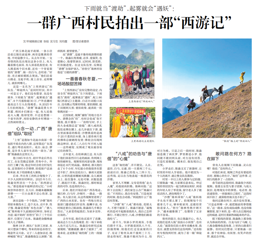 这是一支名为“上里西纪行”的队伍,“师徒四东说念主”是同村村民,其中一双是父子。他们莫得搭景,也莫得脚本,下雨就当“渡劫”,起雾就会“遇妖”,8个月涨粉超30万,户外直播时最高达5万东说念主在线不雅看。从2025年5月拍到当今,“唐僧”陈淼破耗泰半积存,将同乡们聚在一齐,有东说念主说他走火入魔,他却以为,不外是念念圆一个童年的梦,再给懒散的乡村增添少量吵杂和情义。
