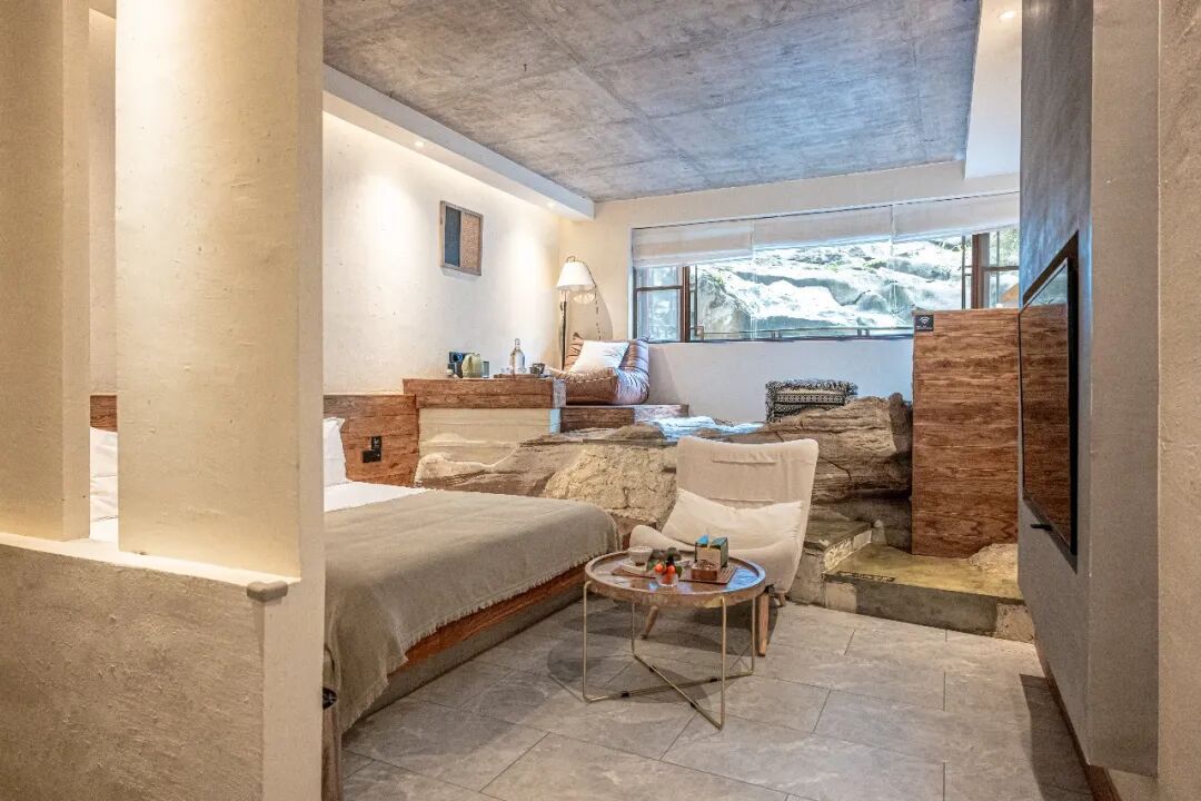 更值得一提的是,阅筑的房间假想极具创造性,险些每间客房都领有不成复制的特质。执政山的一侧,山体巨石奏凯破墙而入,房间呈道路状,重重叠叠,让产物呈现出一种自然的杂沓真义。灯光假想雷同恰到自制,给东谈主奥秘而温馨之感,入夜后与白日全然是两幅光景。临睡躺在床上,嗅觉我方像一只安全的小兽,栖息于窠巢里。