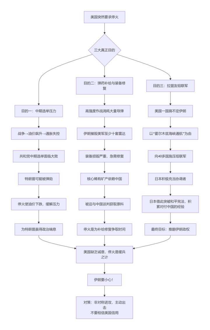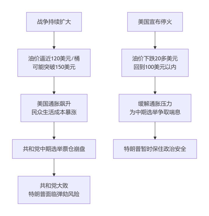 说到底,特朗普和谈,不是因为他心软了,而是因为他怕了。怕油价冲垮我方的中期选举大本营,怕民主党收拢这个契机翻盘。但请防卫,这只是是“暂停”,特朗普推倒伊朗政权的计谋方针,从没动摇过!底下是逻辑图供战友们参考。