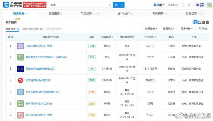 #杨洋不让山河复工#[#杨洋捏股影视公司#]近日,杨洋主演的电视剧《不让山河》剧组发布声明回复争议,否定存在网传“阴阳脚本”“私行加戏”等情况一事激发关爱,开元app后续“杨洋多部待播剧”话题登上热搜。企查查APP知道,亚博体彩当今,杨洋对外投资有上海杨洋影视文化责任室、青岛寒枝文化艺术传播中心(有限搭伙)等多家公司。其中,杨洋捏有北京悦凯影视有限公司约2.02%股权,捏股本事自2016年8月于今。