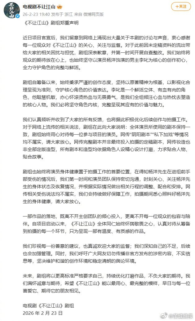 亚博 杨洋捏股影视公司回复《不让山河》争议